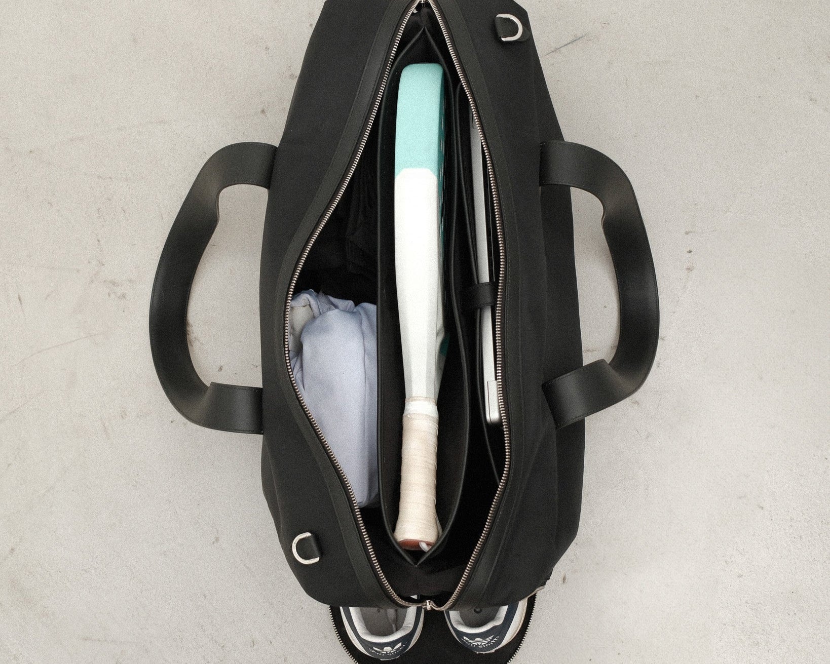 - RACQUET – A tailored compartment that holds a padel racquet (tennis racquets fit as well), featuring a magnetic closure when not in use.